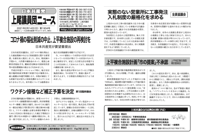 2月8日臨時議会が開催され、新型コロナウイルスワクチン接種費用約10.6億円、西貝塚環境センター修繕工事約3.5億円、あわせて14.1億円の一般会計補正予算(第12号)(補正後940.6億円)と、ワクチン接種に必要な体制を準備するために1月26日に専決処分とした補正予算約2.5億円(第11号)の承認の2つ議案が提出され、全会一致で可決しました。ワクチン接種のための予算は、全額国庫補助金です。 全戸にチラシを配布、クーポン発送やコールセンターなどは一括で発注、株式会社JTBが受託しています。接種は全市民を対象に一人2回、集合と個別接種で、会場は調整中ですが、かかりつけ医(市外でも)や、コールセンターで予約し、受けられる予定です。副反応の対応なども質しました。