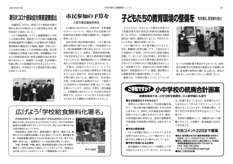 学校給食無料化への署名活動が「学校給食無料化をめざす上尾みんな会」のみなさんにより行われています。市の小中学校の給食代は高額で県下でトップクラスです。特にコロナ禍の中では大変な負担となっています。 学校給食は、食育であり、教育活動の一環です。憲法では、教育にかかわる費用は無償とすると規定しています。教材費を含め、学校給食費も無料とするのが本来の在り方です。県下では、無料、あるいは、一部補助をしている自治体が増えています。 今後、保育園、学園、商店、税金相談会場などあらゆる場所、機会で、SNSも活用して宣伝していくとのことです。「給食みんなの会」はライン公式やツイッターで情報発信しています。