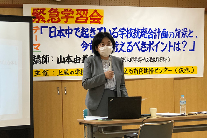 5月15日に和光大学の山本由美先生を講師に迎え「上尾の学校統廃合問題を考える緊急学習会」が文化センターで開催され、共産党市議団が出席しました。