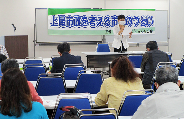 上尾市の今と未来を語り合おうと、市政を変えようみんなの会主催で「上尾市政を考える市民のつどい」が5月23日開催され、日本共産党市議団も参加しました。