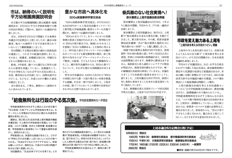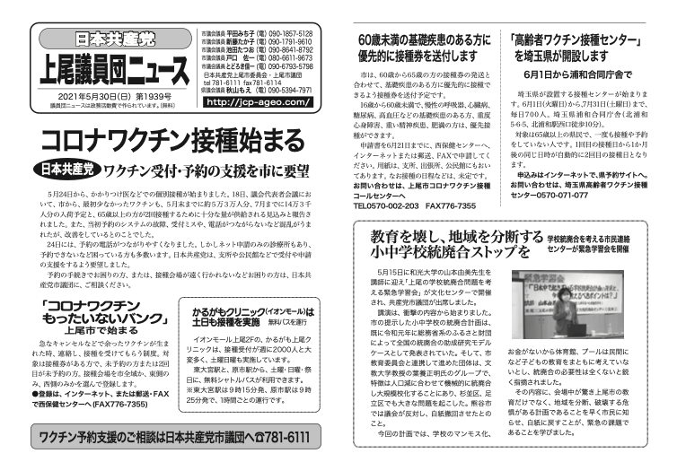 5月24日から、かかりつけ医などでの個別接種が始まりました。18日、議会代表者会議において、市から、最初少なかったワクチンも、5月末までに約5万3万人分、7月までに14万3千人分の入荷予定と、65歳以上の方が2回接種するために十分な量が供給される見込みと報告されました。また、当初予約のシステムの故障、受付ミスや、電話がつながらないなど混乱がうまれたが、改善をしているとのことでした。