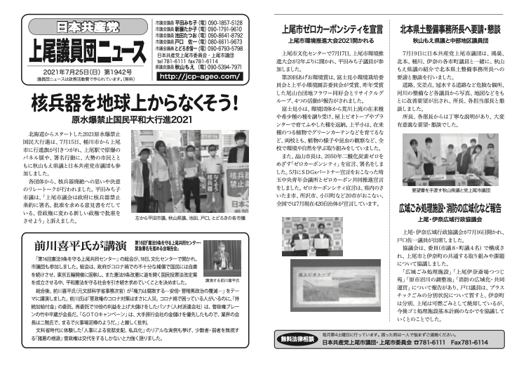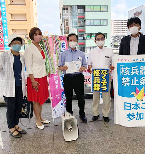 北海道からスタートした2021原水爆禁止国民大行進は、7月15日、桶川市から上尾市に行進旗が引きつがれ、上尾駅で原爆のパネル展や、署名行動に、大勢の市民とともに秋山もえ県議と日本共産党市議団も参加しました。 各団体から、核兵器廃絶への思いや決意のリレートークが行われました。平田みち子市議は、「上尾市議会は政府に核兵器禁止条約に署名、批准を求める意見書をだしている。菅政権に変わる新しい政権で批准をさせよう」と訴えました。