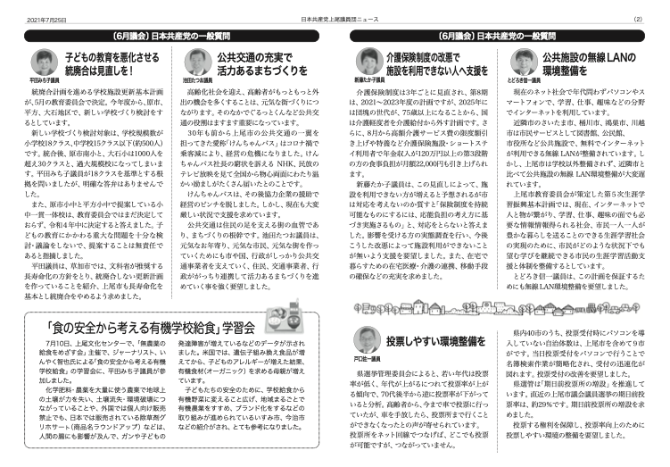 介護保険制度は3年ごとに見直され、第8期は、2021~2023年度の計画ですが、2025年には団塊の世代が、75歳以上になることから、国は介護軽度者を介護給付から外す計画です。さらに、8月から高額介護サービス費の限度額引き上げや特養など介護保険施設・ショートステイ利用者で年金収入が120万円以上の第3段階の方の食事負担が月額22,000円も引き上げられます。 新藤たか子議員は、この見直しによって、施設を利用できない方が増えると予想されるが市は対応を考えないのか質すと「保険制度を持続可能なものにするには、応能負担の考え方に基づき実施さるもの」と、対応をとらないと答えました。影響を受ける方の実態調査を行い、今後こうした改悪によって施設利用ができないことが無いよう支援を要望しました。また、在宅で暮らすための在宅医療・介護の連携、移動手段の確保などの充実を求めました。
