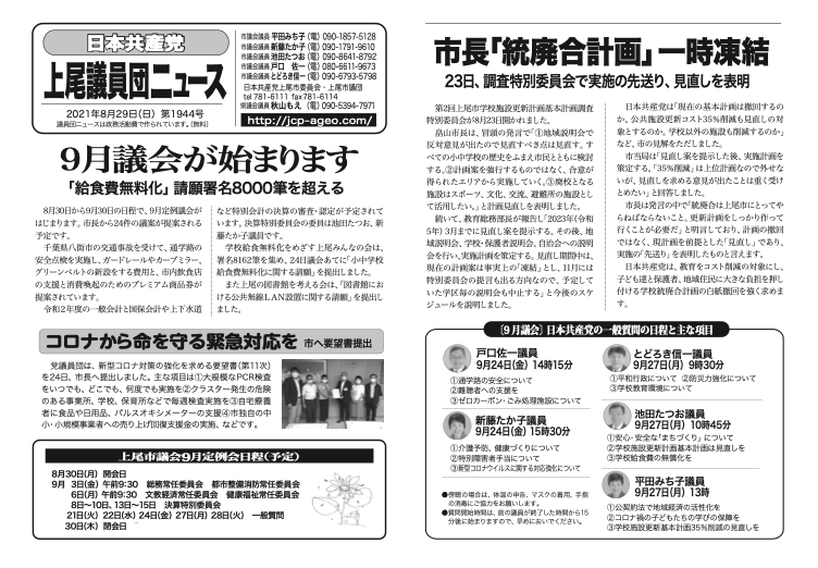日本共産党は、教育をコスト削減の対象にし、子ども達と保護者、地域住民に大きな負担を押し付ける学校統廃合計画の白紙撤回を強く求めます。