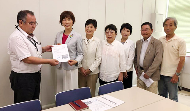 要望書を手渡す秋山もえ、平田みち子、新藤たか子、戸口佐一市議ら