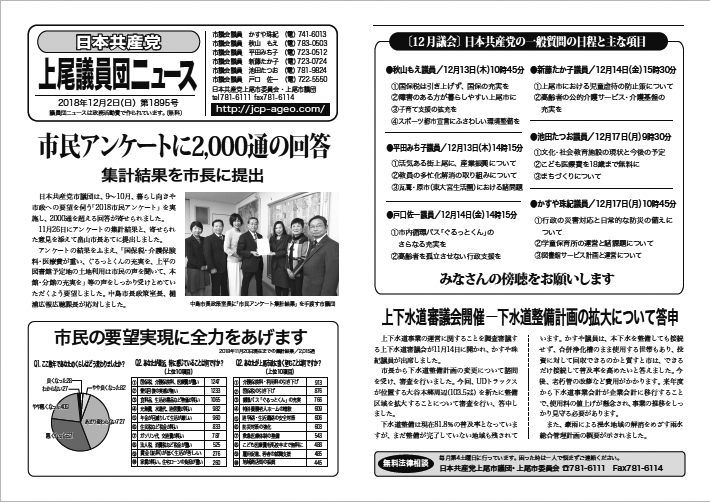 日本共産党市議団は、9〜10月、暮らし向きや市政への要望を伺う「2018市民アンケート」を実施し、2000通を超える回答が寄せられました。