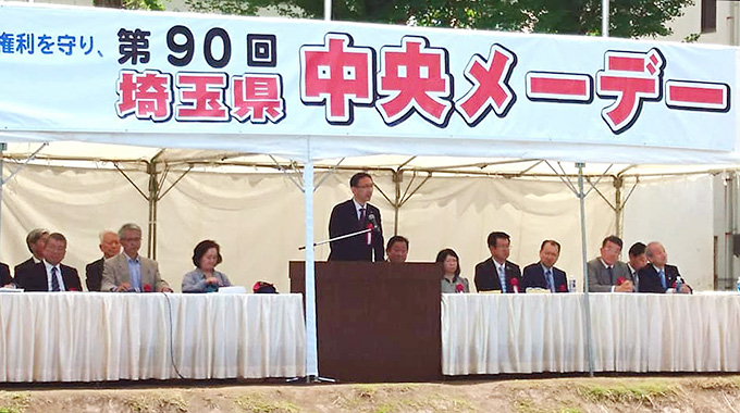 埼玉中央メーデーであいさつする塩川てつや衆院議員