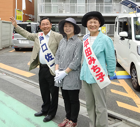 沿道から激励する党市議団