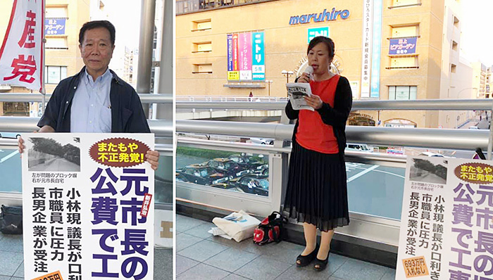 6月議会閉会を前にした6月26日、上尾駅東口で日本共産党市議団が、新井元市長・小林議員による「ブロック塀不正支出問題」を究明する駅頭宣伝を実施しました。