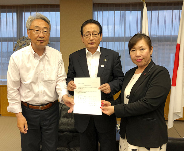 市長に申し入れるかすや議員(右)、浦和議員(左)