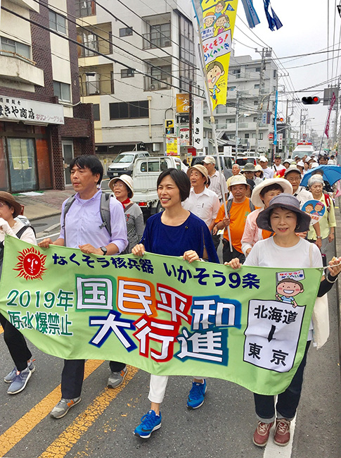 「2019年国民平和大行進」が7月18日、北上尾駅から上尾市役所まで、核兵器廃絶のコールをしながら約80人が行進、市議団も参加しました。