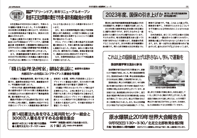 9月定例会が8月30日から始まり、市長から35議案が提案されました。その内6議案は、2018年度の決算審査に係わるので、9月25日からの決算特別委員会で審査され、採決は12月議会に行われます。