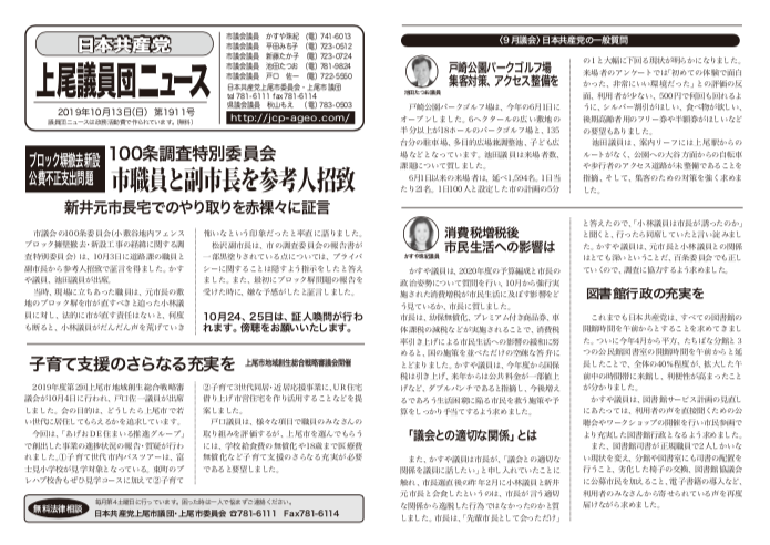 すでに、上尾市議会では「100条委員会」が設置され、10月24日には、当時の都市整備部長、同次長、道路課長を招致し、工事の経過や内容を、25日は、新井元市長、小林議員、畠山市長を招致し、人事介入や3人の関係性について証人喚問が行われます。