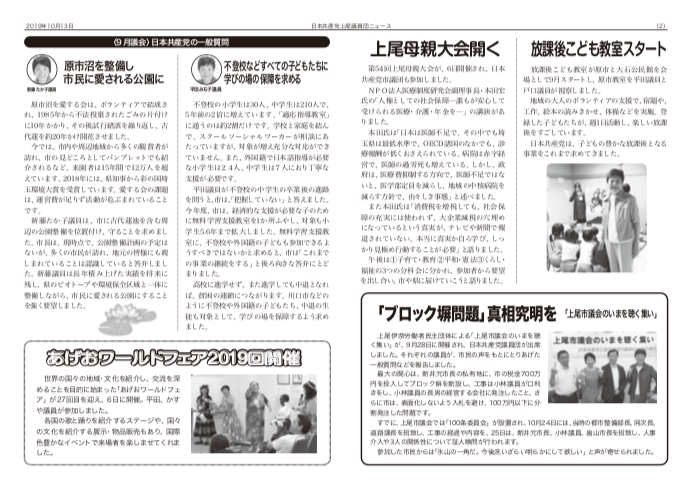市長は、幼保無償化、プレミアム付き商品券、車体課税の減税などが実施されることで、消費税率引き上げによる市民生活への影響の緩和に努めると、国の施策を並べただけの空疎な答弁にとどまりました。かすや議員は、今年度から国保税は引き上げ、来年からは公共料金が一部値上げなど、ダブルパンチであると指摘し、今後増えるであろう生活困窮に陥る市民を救う施策や予算をしっかり手当てするよう求めました。