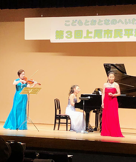 午後のコンサートは、オープニングで上尾鷹の台高校と上尾橘高校の吹奏楽部の演奏で始まり、桃の花グループのピアノ・バイオリン・パーカッションそしてソプラノでの歌声を楽しみました。ロビーでは、戦争遺跡写真展や上尾図書館を考える会の展示がありました。