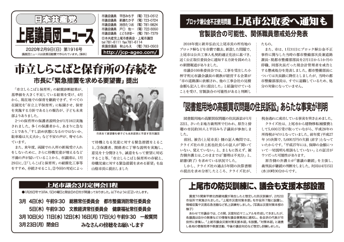 ●「日本共産党上尾議員団ニュース」第1916号(2020年2月9日付)より