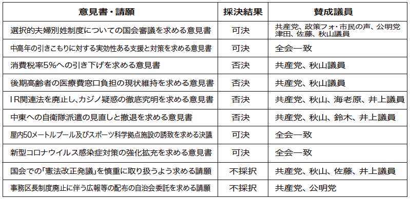 日本共産党は、「選択的夫婦別姓制度の国会審議を求める意見書」を、昨年3月議会で提出しましたが否決されました。今回再提出しました。新しい議会構成で、政策フォーラム・市民の声あげおと、公明党、日本維新の会などの賛成で可決となりました。市民団体「選択的夫婦別姓・全国陳情アクション」によると、地方議会で意見書の可決は3月末で111議会となったとのことです。