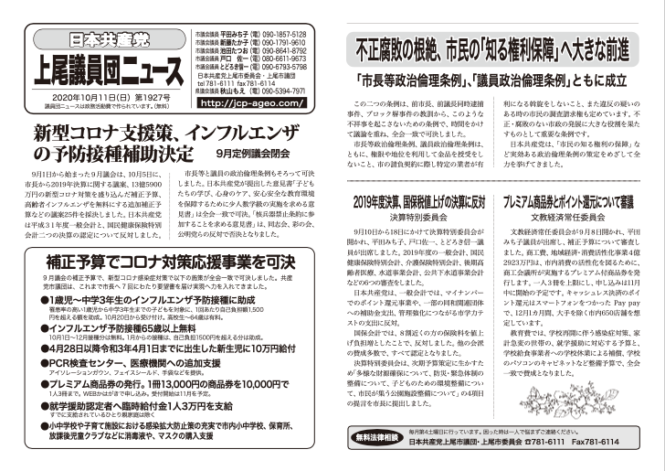 9月議会の補正予算で、新型コロナ感染症対策で以下の施策が全会一致で可決しました。共産党市議団は、これまで市長へ7回にわたり要望書を届け実現へ力を入れてきました。
