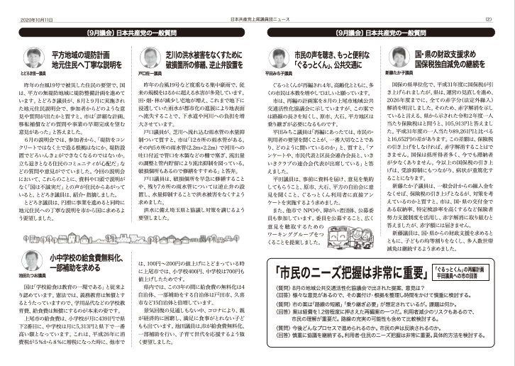 昨年の台風19号で被災した住民の要望で、国は、平方の無堤防地域に堤防整備計画を進めています。とどろき議員が、8月と9月に実施された地元住民説明会で、参加者からどのような意見や質問が出たかと質すと、市は「詳細な計画、移転補償などの質問や事業の早期完成を望む意見があった」と答えました。