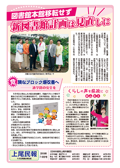 6月18日に発生した大阪北部地震で、児童がブロック塀の下敷きとなり死亡する事故を受けて、日本共産党は、翌日の一般質問でブロック塀も含め、危険な通学路の早急な改善を求めました。上尾市は、国の指示に基づき公共施設の総点検を行い、学校、保育所等で改修が必要なブロック塀は、2学期開始前までに改修工事を行うと発表しました。