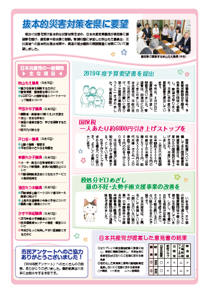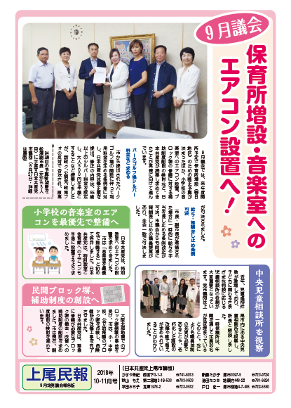 9月議会では、来年度開所予定で保育所増設(春日地区)のための補正予算が決まったほか、小学校の音楽室へのエアコン設置、ブロック塀の修繕に対する補助制度創設の検討など、日本共産党が提案し求めてきたことが実現に向けて進んでいます。